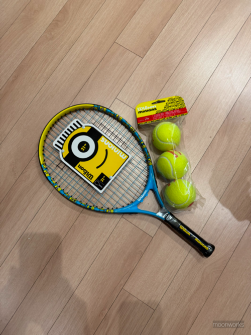 테니스 라켓 고르기 대작전: 아들의 대답을 듣자마자 바로 인터넷 서치에 들어갔다. 아이를 위한 첫 테니스라켓이라니, 어떤 걸 선택해야 할지 신중해질 수밖에 없었다. 예전 수원 스타필드의 윌슨 매장에서 쥐어봤던 미니언즈 테니스라켓이 떠올랐다. 노란색의 귀여운 미니언 캐릭터가 그려져 있어 아이가 좋아할 만한 디자인이었다. 라켓 크기 선택은 조금 더 고민스러웠다. 19인치 vs 21인치. 키와 힘을 고려했을 때 21인치가 더 적합할 것 같다는 결론을 내렸다. 그리고 라켓과 함께 연습용 미니언즈 공도 세트로 구매했다. 귀엽고 부드러운 느낌의 연습공은 테니스를 처음 시작하는 아이에게 딱 맞을 것 같았다.