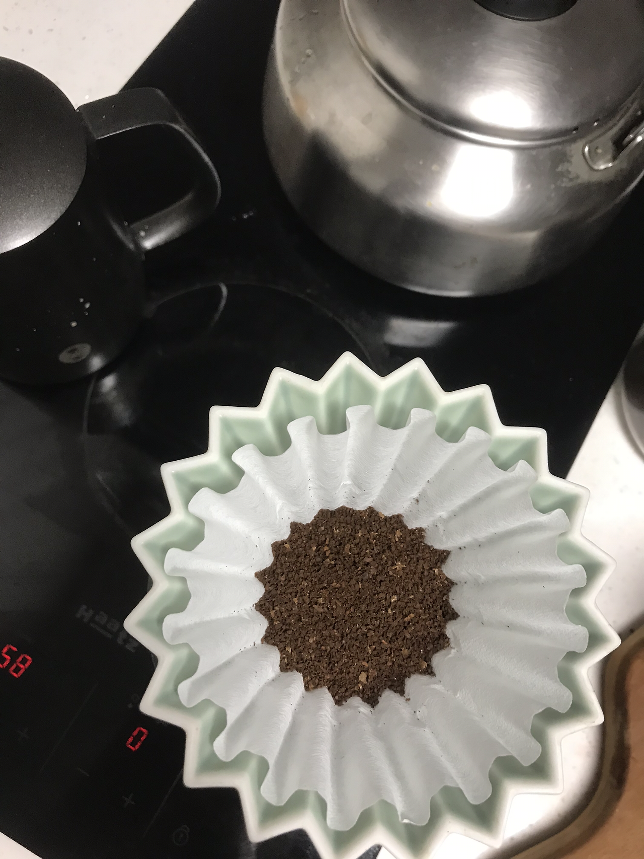 드리퍼를 올리고 1컵 분량의 원두를 담는다.
