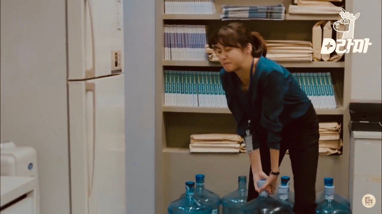 신입 엘리트 안영이가 선배들의 뒤치닥거리를 도맡아하다 정수기 생수통을 가는 장면이었다. 정수기 위에 꽂는 생수통 무게는 18.9리터/ 20kg 정도라고 한다. 그 무게 생수통을 올리다가 힘에 부쳐 바닥에 쏟고 문득 쏟아진 막내 안영이의 안녕하지 못한 현실.