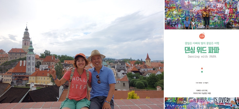 ▲<댄싱 위드 파파>의 공동 저자 아빠 이규선X딸 이슬기의 여행 중 사진과 책 표지 이미지.(이슬기 제공)