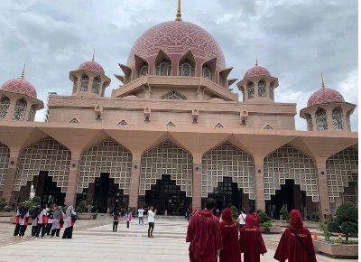핑크모스크 (Putra mosque)는 푸트라자야레이크 위에 지어졌다고 한다. 모스크 안으로 들어가려면 투어큐알코드를 찍고 오른쪽 카운터에서 가운을 받아 입고 들어간다. 큐알코드를 찍는 곳에 한 가이드가 계셨다. 가운을 입고 오면 같이 다니면서 모스크 안을 소개해준다고 하셨다. 여자는 모두 가운을 입고 가운에 달린 모자를 쓰고, 남자들은 반바지일 경우만 가운을 입는다고 했다.