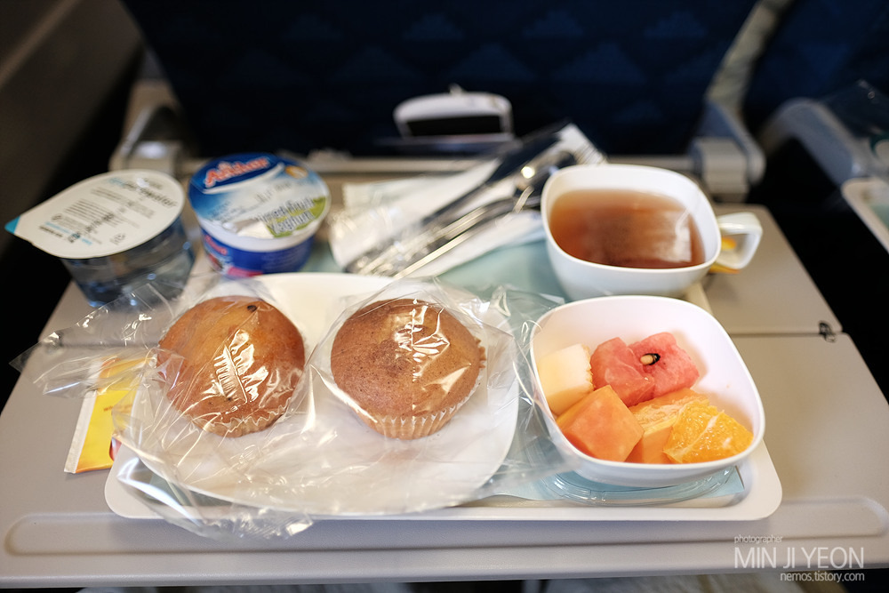 벌써 3번째 대한항공 기내식이 나왔어요~ 소고기 비빔밥 - 피자빵 - 간단한 빵과 과일 & 티