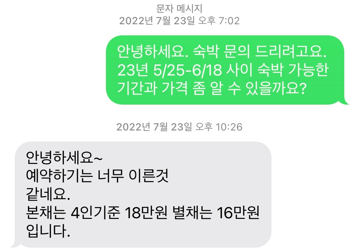 그렇게 숙소를 고른 시점이, 무려 한 달 살기 여행의 목표 시점의 11개월 전이었다. 파워 J 부부는 미리 이들 숙소의 예약을 확정하지 않으면 나중에 누가 먼저 채갈까 염려되었다. 그리하여, 아직 숙소 예약을 받지도 않은 이른 시점에 호스트에 전화를 했다.