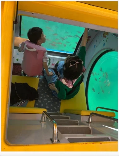 잠수함 안이 더웠기에 땀이 난 옷을 펄럭 거리며, 원래의 티켓 부스 있는 곳으로 갔다. 구명조끼를 반납하니, 아이에게 수료증 형식의 배지를 주었다. 아이가 좋아했다.
