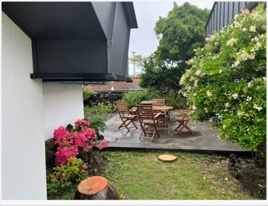 우리는 '우와~~' 감탄사를 연발하며, 숙소 안으로 들어왔다. 거실 창문 아래에 놓인 의자에 앉자, 푸른 정원과 파아란 하늘이 한눈에 들어와, 벌써부터 행복해지기 시작했다. 화장실 복도가 조금 무서워, 아이가 화장실이 가고 싶을 때마다, 매번 엄마와 아빠를 찾았지만 그 정도는 괜찮았다.
