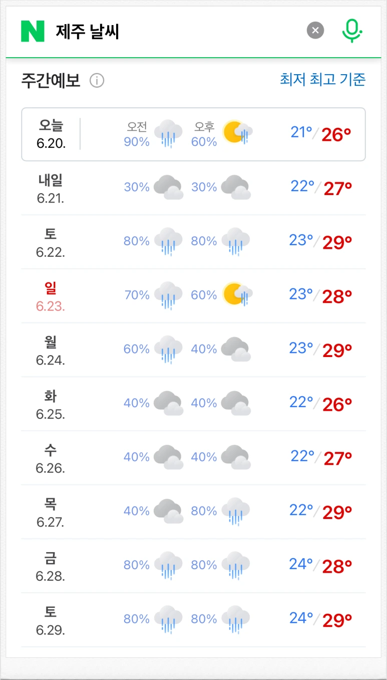 이번 주말 1박 2일로 제주를 가야 하나. 생각보다 저렴한 항공권 가격에 마음이 부풀었다. 그러나 금세 싸한 느낌이 머리를 스치고 지나간다. ‘혹시…?’ 하고 날씨 앱에 들어가 본다.