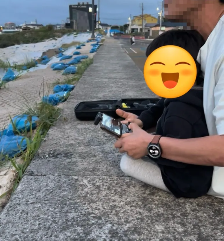 다행히 바닥에 추락할 뻔한 드론은, 원 주인의 조종으로, 다시 멋지게 하늘을 날아올랐다. 다행이었다. 초면에 큰 실례를 할 뻔했다. 아마 이 분도 철렁 하셨겠지. 그렇게 아이는 제주에서 생애 처음으로, 드론을 조종해 보는 경험을 해보게 되었다.