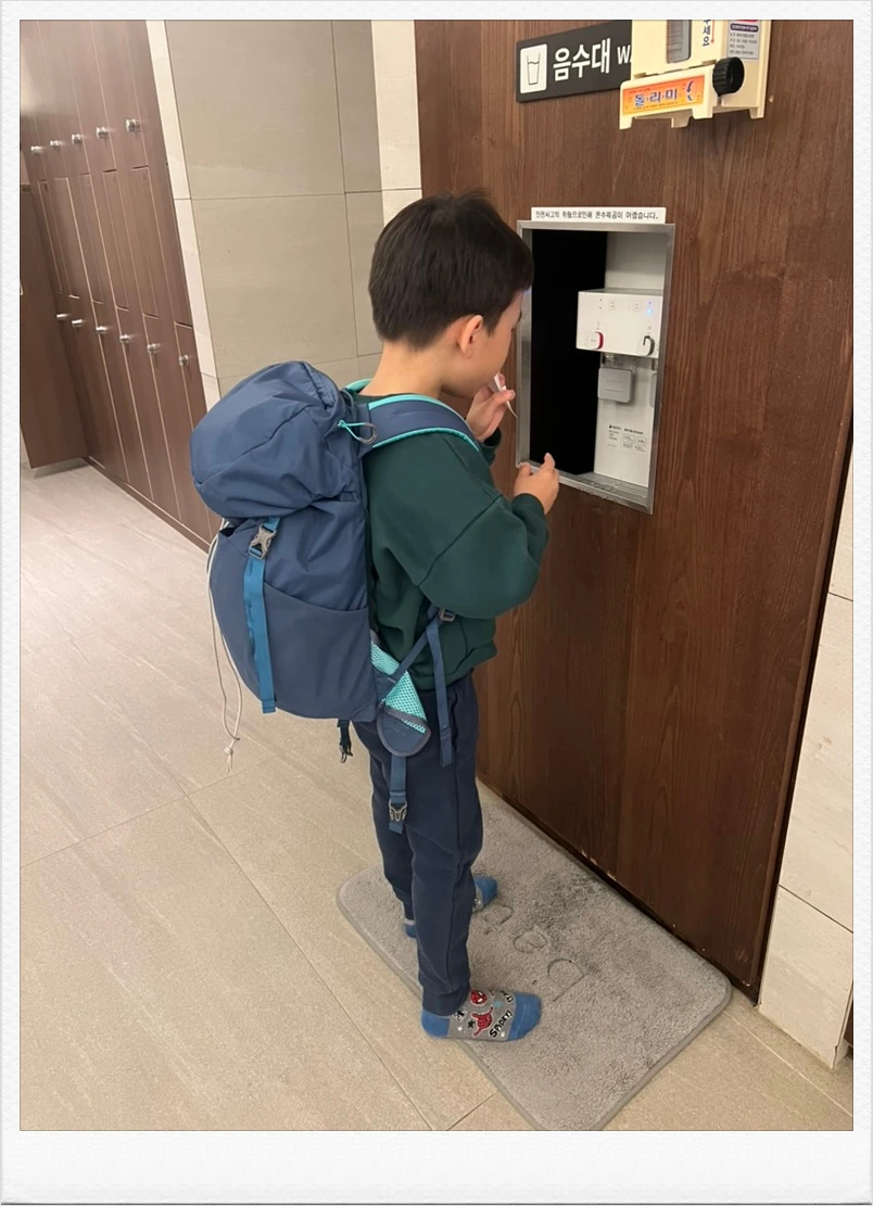 순식간에 옷을 갈아입었다. 목이 마르다며 찜질방 안에 설치된 정수기에 가서 물을 먹는 모습에 문득 웃음이 나왔다. 따봉이(아이의 배낭 이름)를 참 잘도 메고 다니는구나.