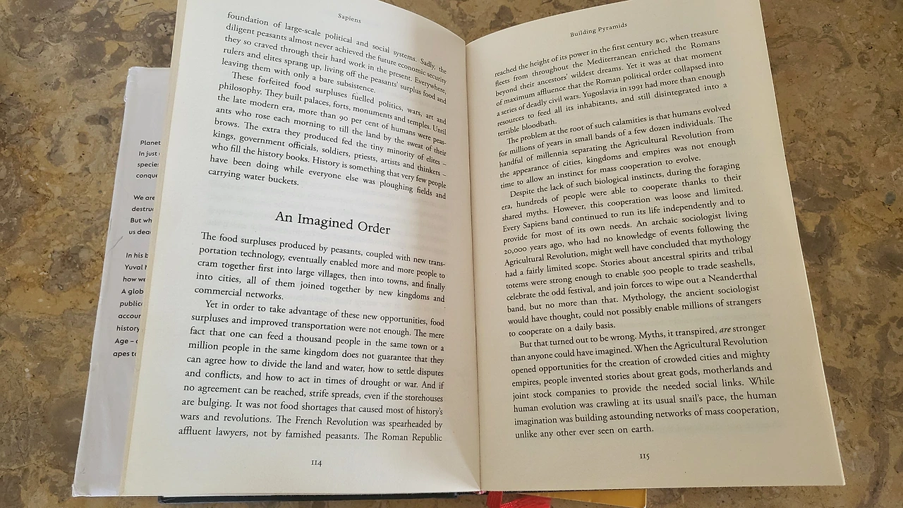 We owe imagined orders a great many things for saving our necks, but the clear definition of imagined orders is still unboxed. An imagined order is a ‘myth’ under which people unite to work together towards that goal. This encourages trust in another person even if they are a stranger, increasing the likelihood of making a friend. Nonetheless, imagined orders exist in many variations, including money, rights, and religion. Money usually consists of metal coins and paper: this is a social construct as we are convinced that it is valuable. Rights are similar in their own right. The American Declaration of Independence states that every man has their own equal right to enjoy liberty, happiness, and prosperity. However, nature says nothing of the sort: there is nothing in our blood that proves it, except in our mind. A slightly more alarming ‘myth’ is religion, as science cannot support religious ideas. Yet, our brain learnt to accept these ‘opinions’, whether it is true or not: the power of the two-faced imagined orders.