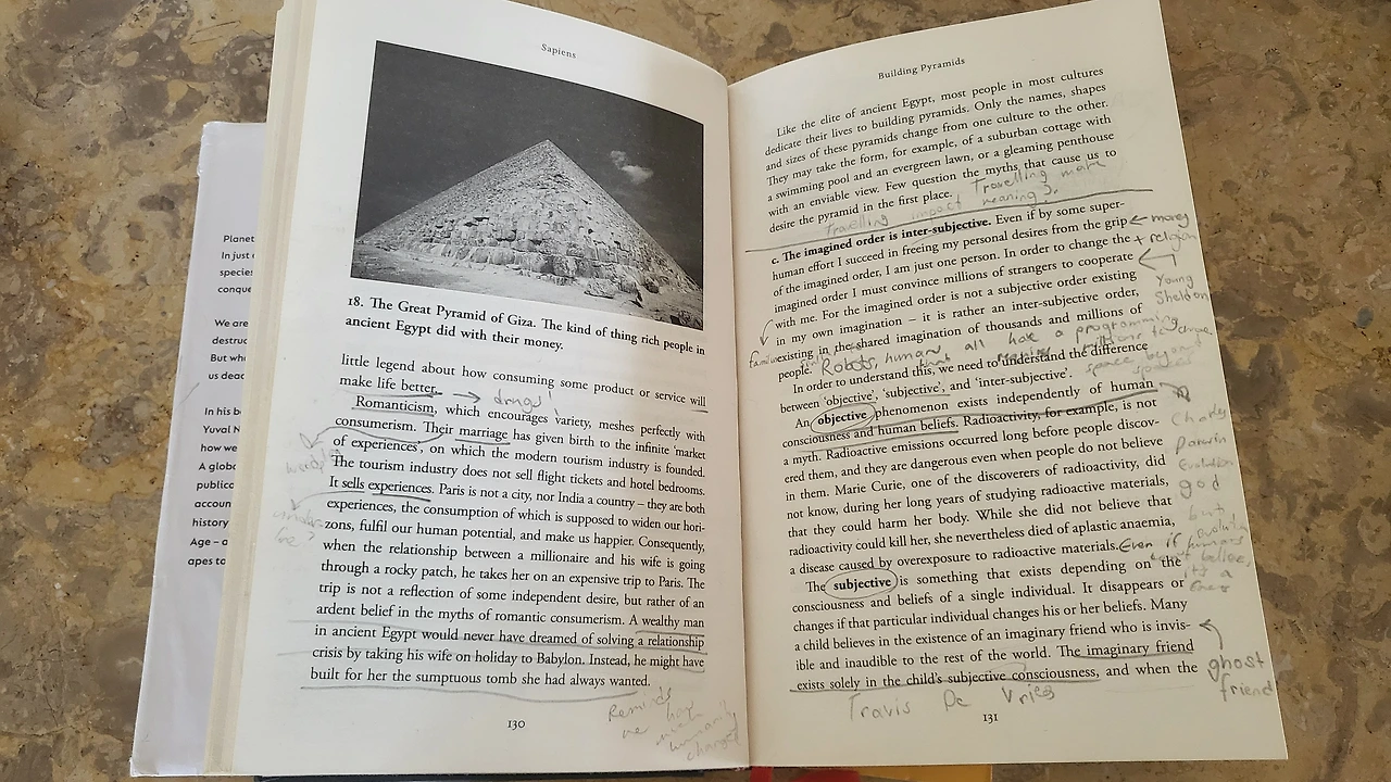베이지 톤의 내 책장은 낡고 해진 책들로 채워져 있는데, 그중 내게 가장 큰 영향을 준 책은 유발 노아 하라리의 명작, 사피엔스다. 인권과 정의가 오직 우리 의식 속에만 존재한다고 외치는(내 삶이 거짓이라는 것을) 이 책에서 내 생각을 뒤흔든 핵심 개념은 상상의 질서였다. 혈연과 상관없이 이야기를 통해 권위가 결정된다는 이 상상의 질서는 오늘날까지도 우리의 일상 행동을 좌우하고 있다. 하지만 그 기원, 의미, 중요성은 면밀히 들여다보지 않으면 여전히 미지의 영역으로 남아 있다.