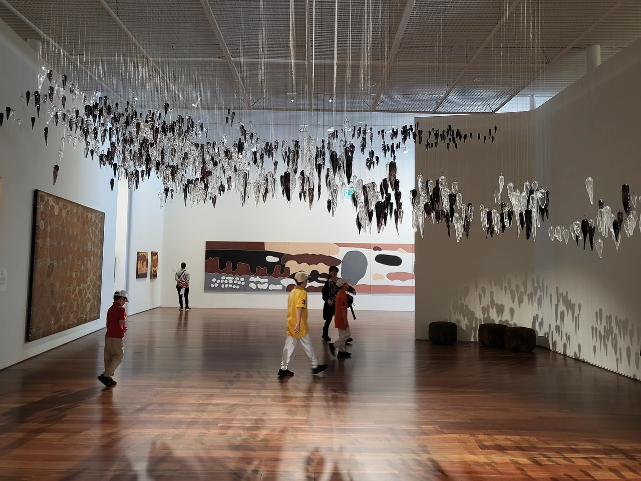 Another Aboriginal artwork reflects on the Aboriginal rights erased by the British. Yhonnie Scarce’s Death Zephyr is a suspension of 2000 individual glass shards suspended in the air, stuck in the assumption of going up or down. This artwork is a tribute to a British nuclear weapon testing on Aboriginal land. While the air raid siren went out for any British settlers in rural areas, the British cut the line over Aboriginals, rendering them unaware of the testing. As a result of direct and indirect exposure to nuclear testing, 2000 Aboriginals died. The 2000 individual glass shards is therefore an allusion to how the nuclear test moults the surrounding sand into glass, and the number of Aboriginals killed during the ignition.