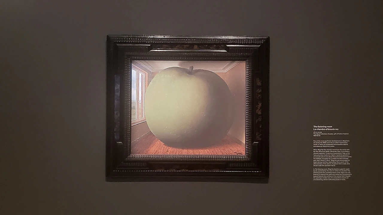 Another one of the most frequent and recognisable of Magritte’s motifs: the apple. The Listening Room depicts an inflated green apple trapped inside an empty, tiny room just barely containing the apple, which looks almost solemnly out the window, its green glow rebounding onto itself, unable to reach the vast, free world it sees. The tiny room contrasts well with the oversized green apple, which almost plays with the viewer as the green apple is more uncommon than the red apple, imitating Alice from Alice in Wonderland when she eats a small cake largening her. Magritte drew inspiration from this short story, questioning the limits of overprotection and the boundaries of curiosity. While the apple acts as a focal point, the room overrides this focus by representing to us a confined space of contemplation.