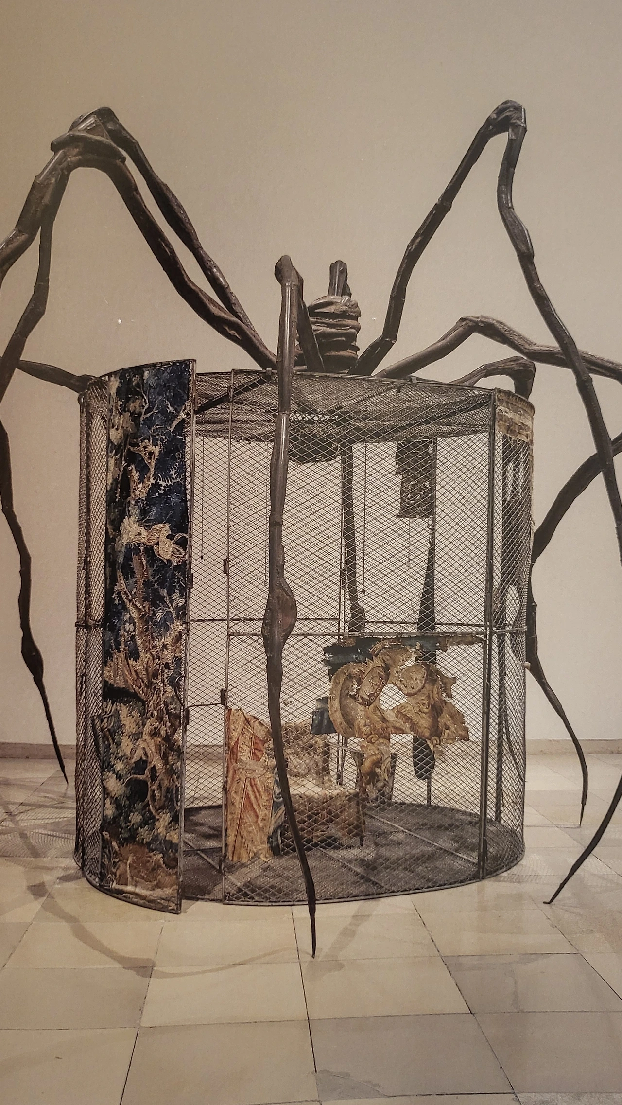 Le Defi II occupies the space of a wooden shelf filled with glass vases and bowls. What the typical art viewer would take for a stray piece of IKEA furniture in an art gallery explores Bourgeois’ past life reflections, raising awareness and self-identity for Bourgeois. For me, the light illuminating the glass represents the spark of life ongoing, battling internal conflicts, while the fragility of her mind and unspoken traumas is balanced in glass. Its transparency strips the sense of self-identity, an almost uncanny factor among her artworks. Its sense of vulnerability is almost as if it is protected by another one of Bourgeois’ artworks: Spider 1997.