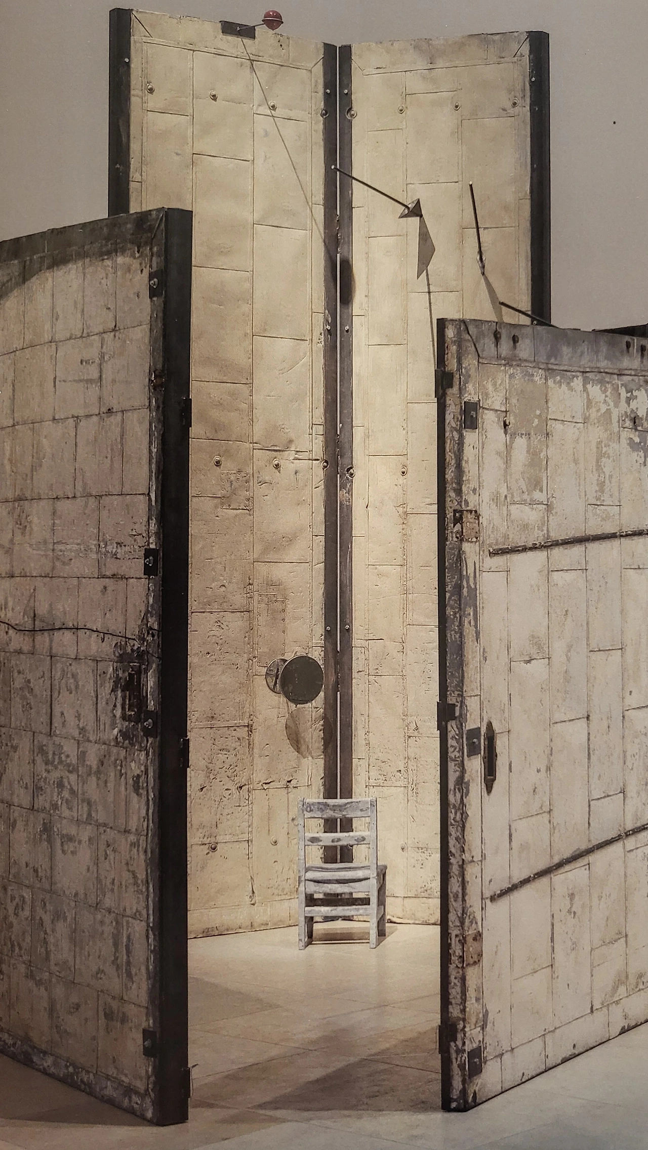 Constructed as a homage to Bourgeois’ mother, Josephine, Spider 1997 takes the appearance of a spider, a motif appearing frequently throughout Bourgeois’ artworks, hovering over a cell. Yet, the spider fails to appear as a creepy stalker, yet standing for the caring and strong characteristics of Bourgeois’ mother and her sheltering, sometimes overwhelming, affection to Bourgeois. The cell walls are periodically wrapped with tapestries brought from the Bourgeois family tapestry business. A tapestry embroidered armchair sits in the centre, which Bourgeois remembered her mother being the happiest, sitting in the sun and embroidering. Spider 1977’s cell looks dismal, yet this was Bourgeois’ home from far away, a memory-furnished room of her own.