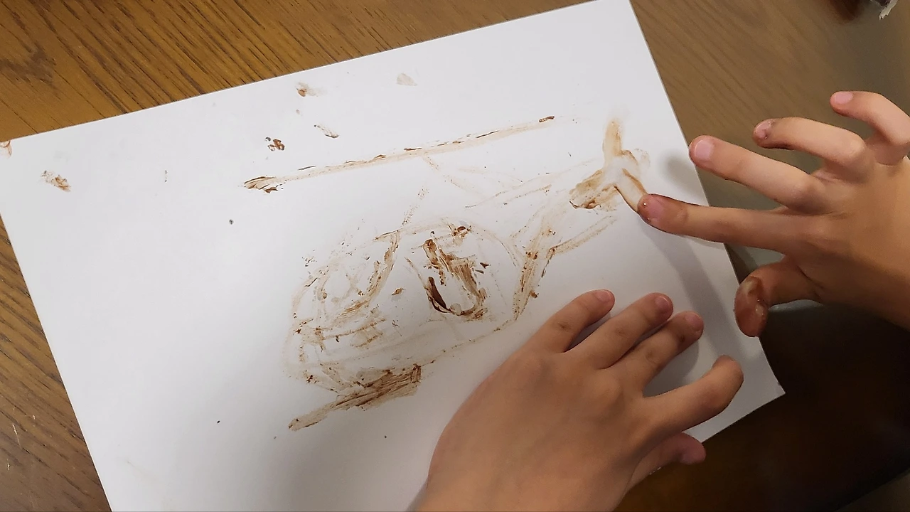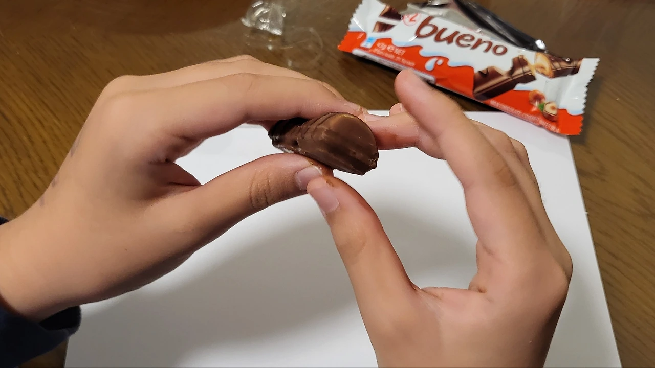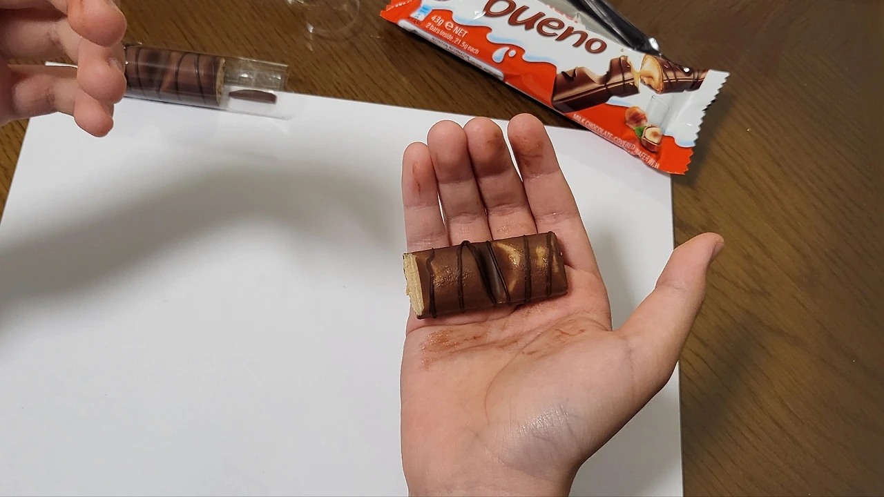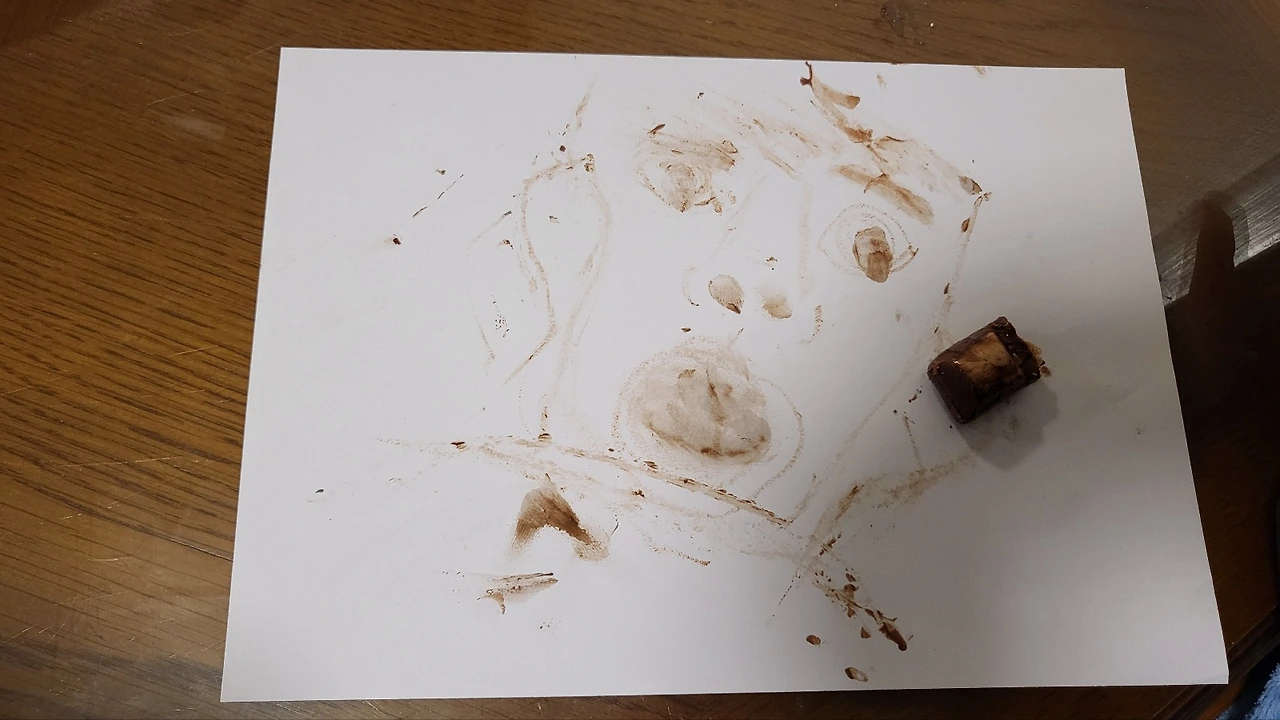 쇼운 글레드웰의 영감을 받아 나도 초콜릿 드로잉을 시도해보았다. 킨더 부에노로 그려 본 내 동생(왼쪽). 내 동생은 헬리콥터(오른쪽)를 그렸다.