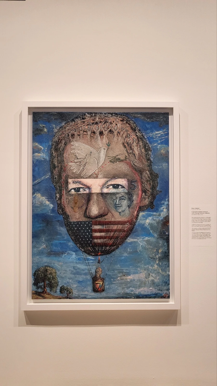 Upon a further glance beyond the canvas of A spangled symbolist portrait of Julian Assange floating in reflection, I realised that there was more to this than the balloon. Peace, murder, and harmony all make up this artwork. Two doves with roses in their beaks carry peace. Murder is stabbed onto the painting by a shooting Apache from Collateral Murder. Harmony is conveyed by a human chorus in white braiding a hot-air balloon. This aircraft is extraordinary, though, as the balloon itself is Assange's head, his mouth gagged by the Star Spangled banner. A 5 pound note is pounded onto Assange's left cheek. Desaturated yellow spangles are littered across the painting, evoking the American flag. The cockpit contains Shaun Gladwell flying the balloon up the sky, with a 7 emblazoned on the basket. The 7 long years in the US Ecuador prison, punishment for speaking the truth. The most appealing feature is yet to be revealed. The overall shadow cloaking everything emulating the iconic helmet worn by a bushranger: Ned Kelly.