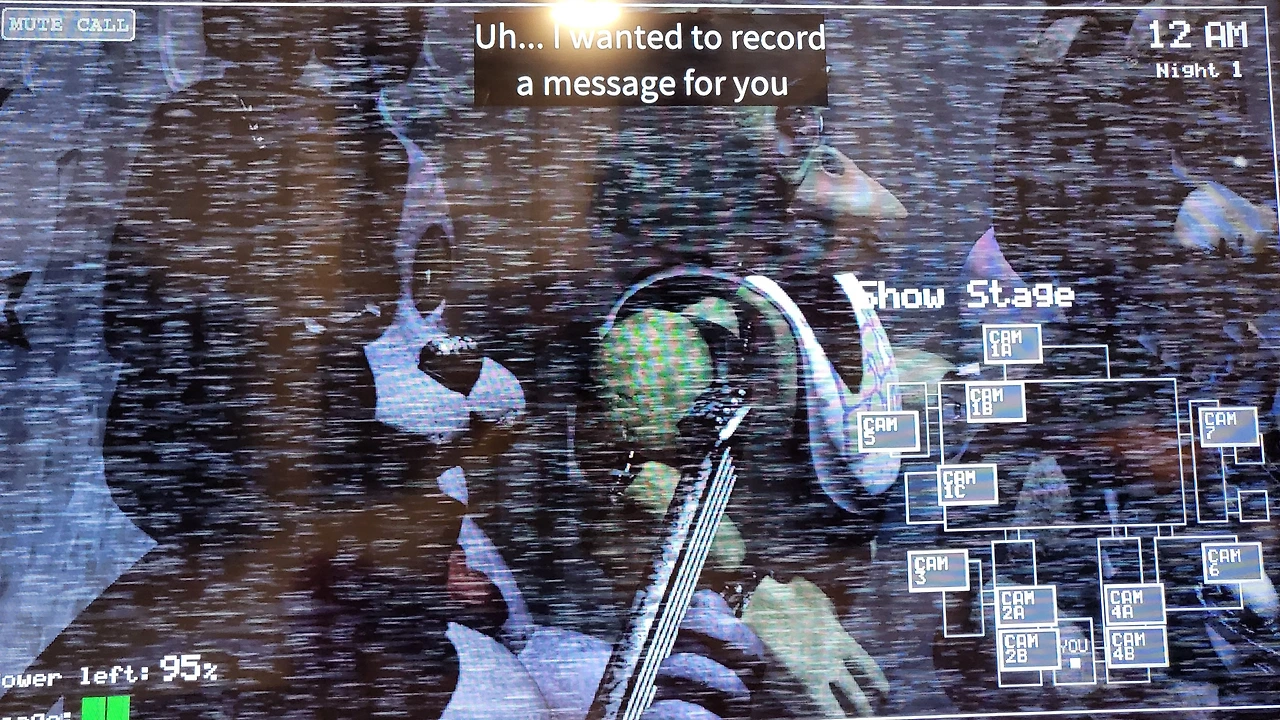 On the cameras, the stage revealed the animatronics: Bonnie the rabbit with a guitar, Chica the chicken with her “LET’S EAT!!!” bib, Freddy the bear in his top hat, and Foxy the Pirate lurked behind red curtains. The cameras glitched, emitting static, as I turned the monitor on and off. Glancing back at the cameras, I gulped when I saw the show stage missing Bonnie. In the distance, I picked up the clicking of servos approaching.