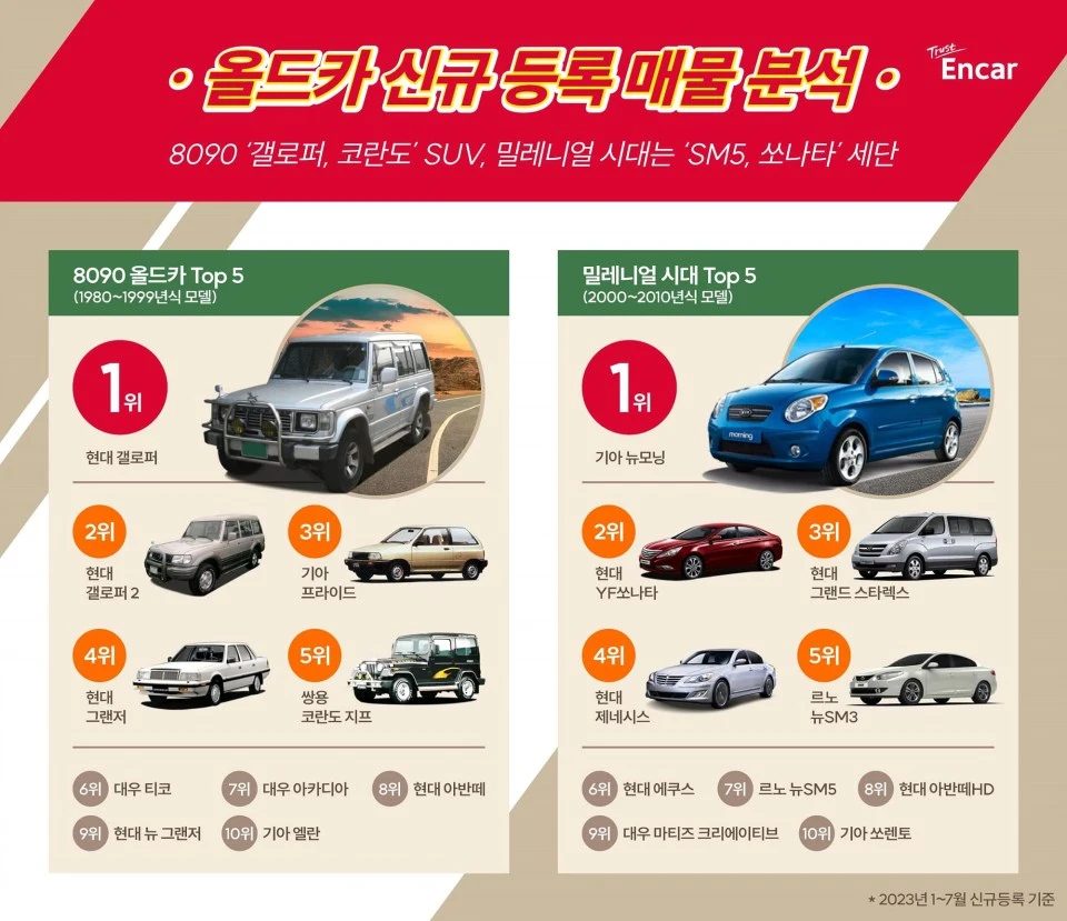 엔카닷컴이 1980~1999년식, 2000~2010년식으로구분해 1월부터 7월 기간까지 신규 등록된 Top 10 모델을 분석했다. 빅데이터 분석 결과, 80-99연식은 정통 SUV, 2000년대 초 밀레니얼 시기는 세단과 경차 중심으로 중고차 거래가 이뤄졌으며, 이 중 인기가 높은 올드카는 현대 갤로퍼, 기아 뉴모닝으로 나타났다.