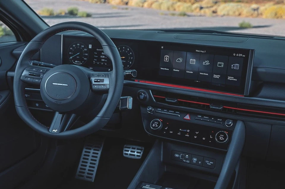 실내 역시 12.3인치 디스플레이 두 개를 나란히 배치한 통합형 와이드 디스플레이가 적용된다. 여기에 칼럼식 기어레버, 신규 스티어링 휠이 적용되며, N 라인 모델의 경우 N 엠블럼 적용 및 레드 포인트 컬러를 적용했다.