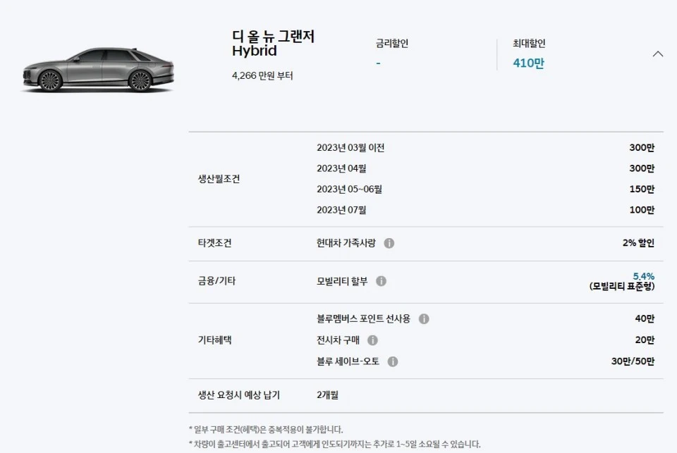 그랜저 하이브리드의 경우 4월 이전 생산분에 대해 300만 원을 할인해주며, 5~6월 생산분은 150만 원, 7월 생산분은 100만 원을 할인 해준다. 여기에 블루멤버스 포인트 선사용, 전시차 구매 등 기타 혜택을 더할 경우 최대 410만 원을 할인 받을 수 있다.