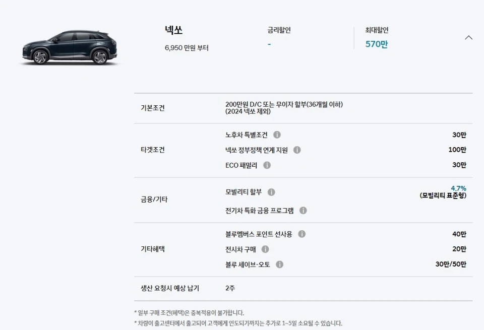 노후차 특별조건은 차령 10년 이상 보유 고객이 넥쏘 구매 시 30만 원을 할인해주며, 넥쏘 정부정책 연계 지원은 환경부 K-EV100 또는 산업통상자원부 환경친화적 자동차 구매 목표제 회원사 직구매 및 임직원 개인구매를 대상으로 100만 원을 할인해 준다.