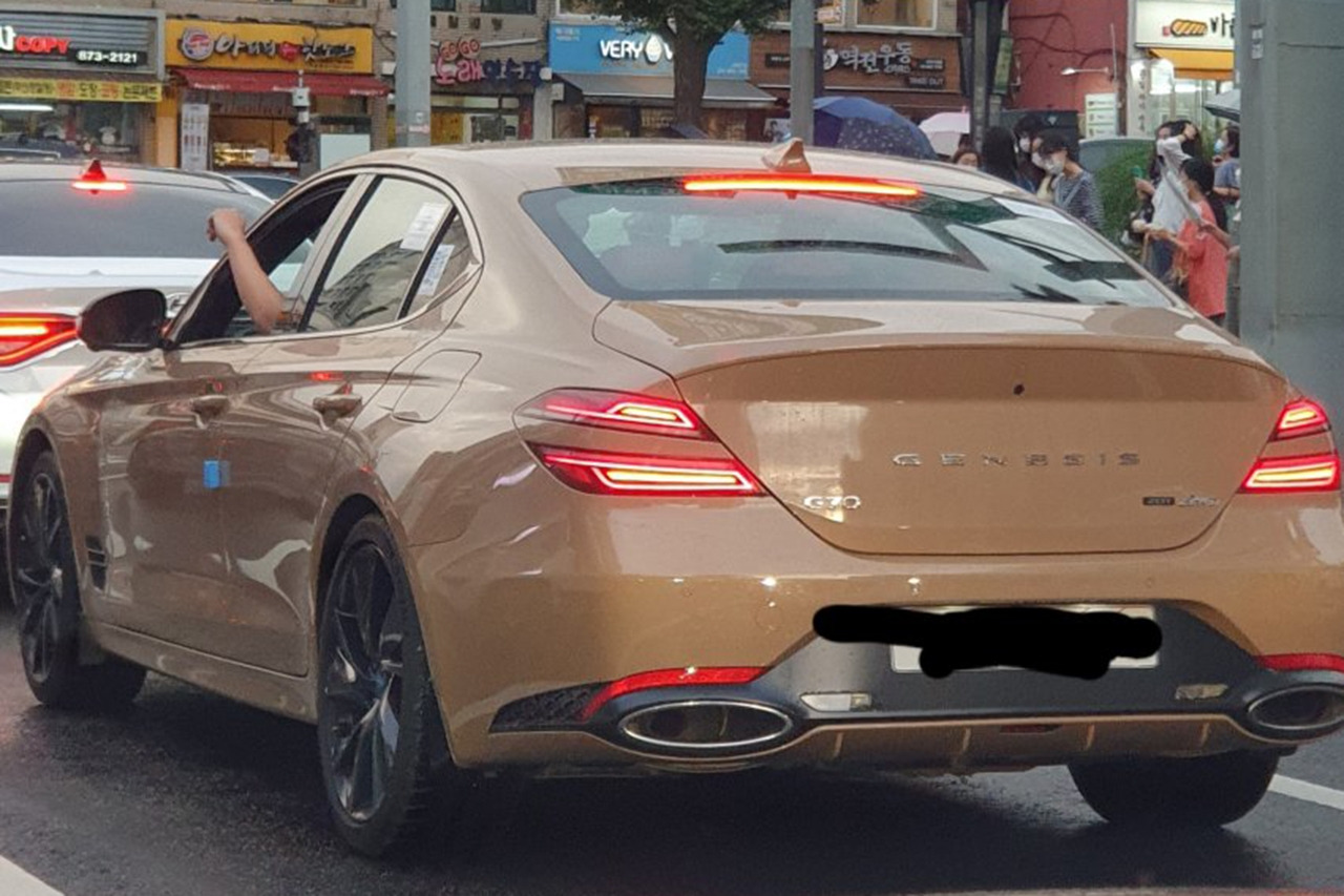 제네시스 G70 페이스리프트 모델의 실물이 포착됐다. 9일(수) 공식 이미지가 공개된 당일 온라인 커뮤니티를 통해 G70 페이스리프트 실물이 공개된 것이다. 포착된 G70은 사하라 베이지 컬러와 블랙 색상의 휠이 적용된 것을 확인할 수 있고, 9일 공개된 이미지에서 정확히 공개되지 않은 후면 디자인을 정확히 확인할 수 있다.