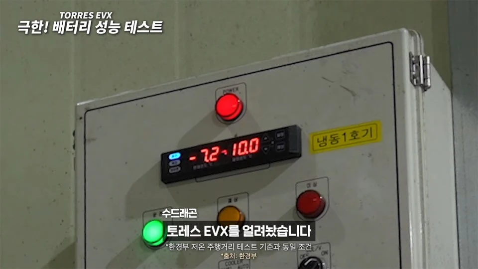 이어서 바로 저온환경 테스트를 진행했다. 테스트 장소는 영하 7도의 냉동창고인데, 이 온도는 환경부 저온 주행거리 테스트와 같은 조건이다. 냉동창고에 토레스 EVX를 보관한 뒤 앞선 실험 조건과 동일한 배터리 잔량 65%에서 실험을 시작했다.