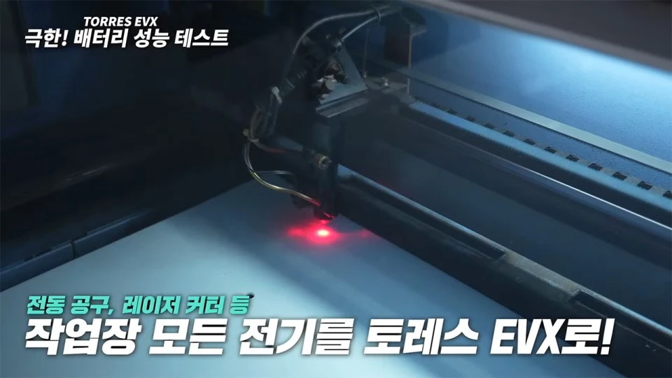 실험 시작 당시 토레스 EVX의 배터리 잔량은 65%였다. 작업장 전원 차단 후 전동 공구, 레이저 커터 등 작업장의 모든 전기를 토레스 EVX의 배터리를 이용해 작업한 결과 약 7kWh의 전력량을 소비했고, 배터리는 약 10%가 소모됐다.
