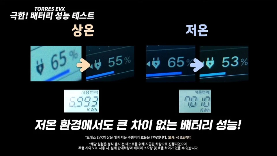 상온 환경과 저온 환경에서 큰 차이가 없는 것으로 나타났는데, 주행 환경과 V2L 사용 시 배터리 소모 효율에 차이가 있는 점은 고려할 필요가 있다. 참고로 KG모빌리티에서 밝힌 토레스 EVX의 상온 대비 저온 주행거리 효율은 77% 수준이다.