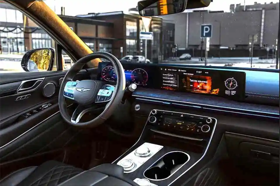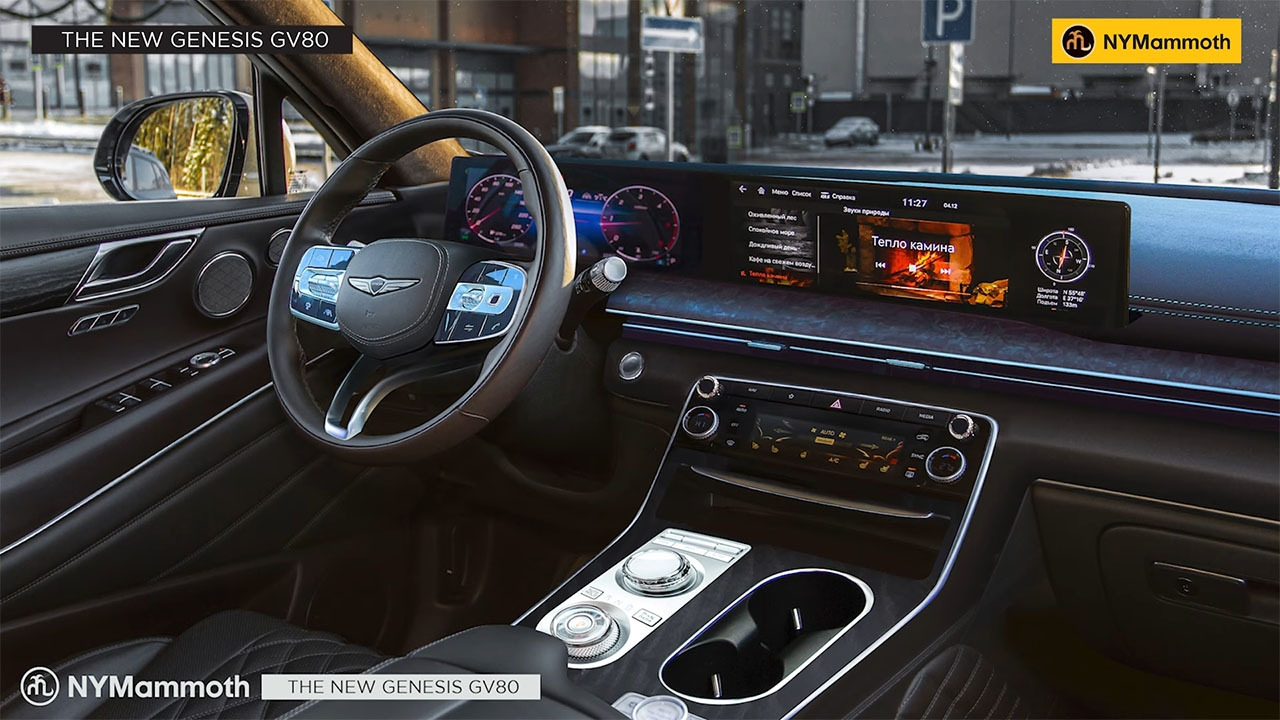 유출된 실내 디자인을 기반으로 국내 신차 예상도 유튜버 ‘뉴욕맘모스’는 높은 완성도의 예상도를 제작했다. 신형 GV80의 실내는 최근 현대차의 실내 레이아웃과 유사한데, 고급소재를 사용해 고급감을 높이고, 하나의 27인치 와이드 OLED가 적용되는 것이 특징이다.