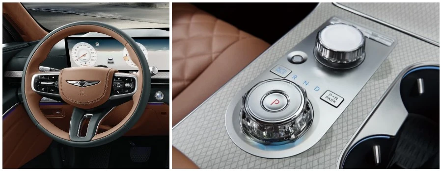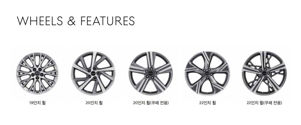 신형 GV80의 22인치 휠은 두 줄 라인을 재해석해 볼륨감 있는 디자인을 완성하고, 쿠페 모델 전용 22인치 휠은 얇은 스포크를 사용해 스포티한 느낌을 강조했다.