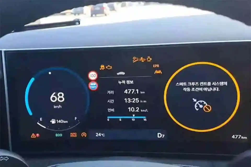 영상 속 차량은 신형 싼타페 2.5 가솔린 터보 모델로 477km를 주행한 신차다. 영상 설명에 따르면 고속도로 주행보조 장치를 켜고 주행 중 모든 경고등에 불이 들어오더니 가속 페달도 먹통이 된 상황이다. 이후 갓길에 주차 후 시동을 껐다가 켜니 엑셀은 작동, 경고등은 사라지지 않았다.