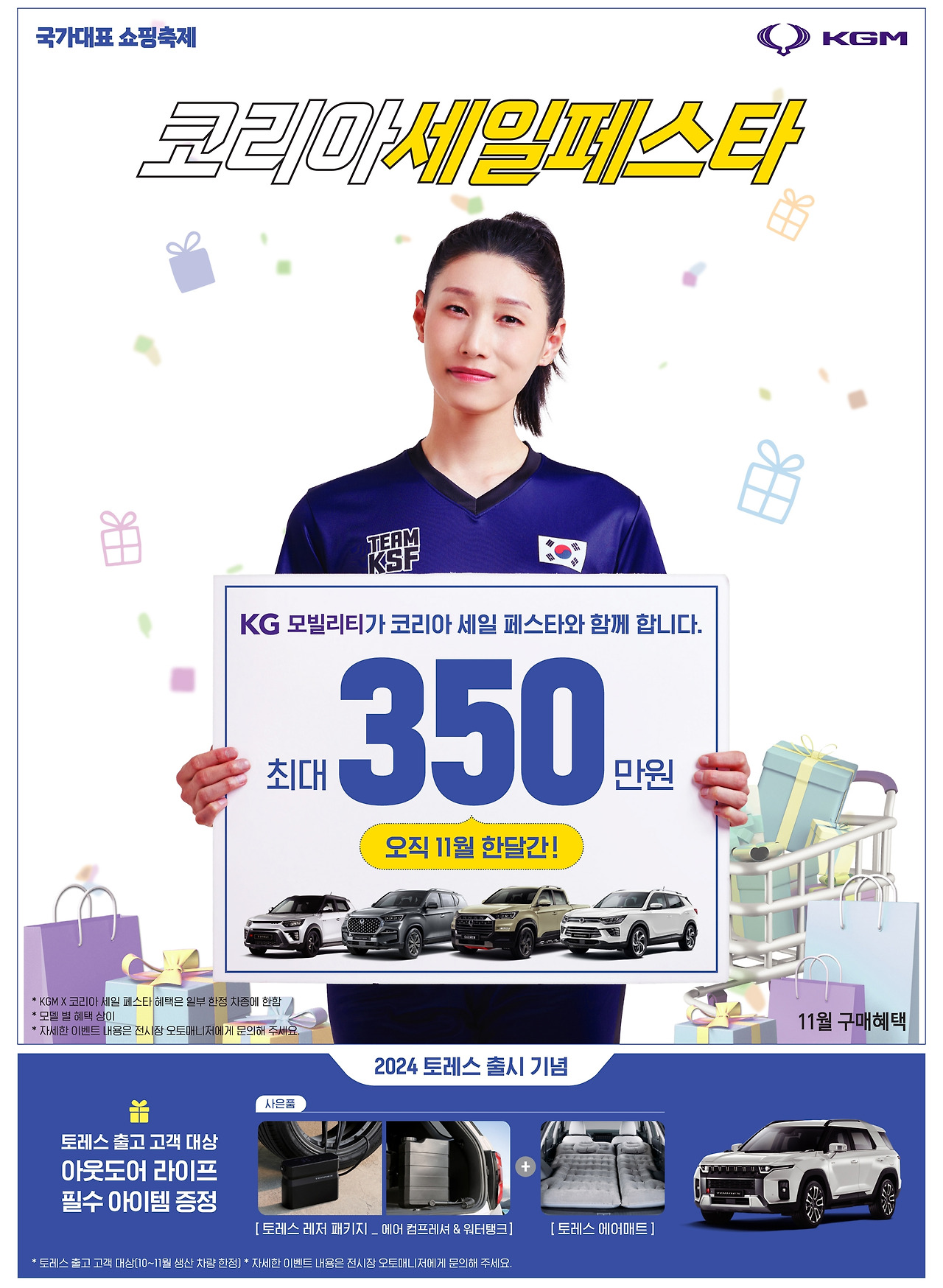 코리아세일페스타 해당 모델인 ▲더 뉴 티볼리(에어 포함)는 최대 300만 KG M포인트를 제공(할인)하고 ▲코란도와 토레스는 최대 50만 KG M포인트를 제공한다.