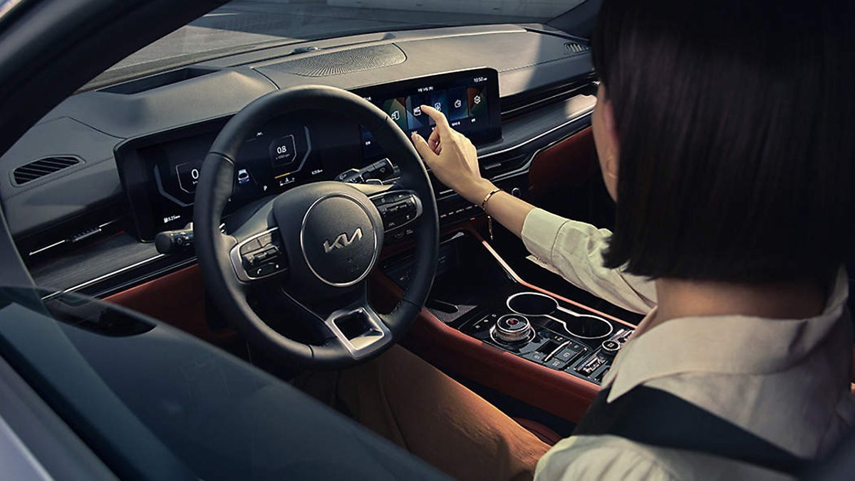 형 K5의 실내는 최신 인포테인먼트 ccNC를 적용하는 등 큰 변화가 이뤄졌다. 대표적으로 12.3인치 디스플레이 두 개를 나란히 배치한 통합형 와이드 디스플레이를 적용하고, 터치 공조/인포테인먼트 전환 조작계를 적용해 하이테크한 느낌을 준다.