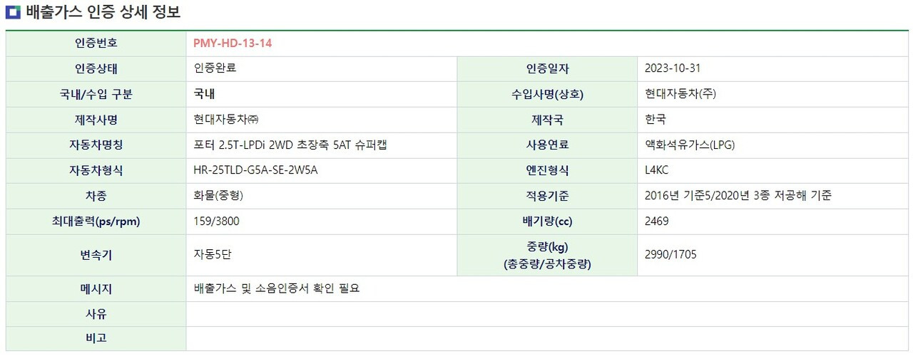 현대차 포터 LPG 모델 출시가 다가오는 가운데, 제원 일부가 공개됐다. 최근 현대차 포터 LPG 모델은 환경부 배출가스 및 소음 인증을 완료했다. 포터 LPG 모델은 2.5리터 LPG 터보 엔진을 탑재해 출력을 개선한 것이 특징이다.