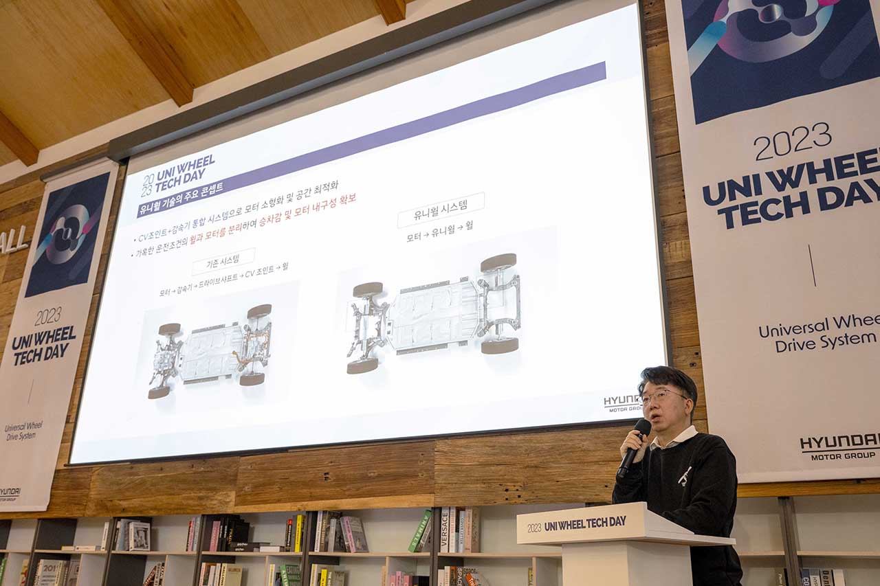 현대차그룹이 28일(화) 커뮤니티하우스 마실에서 ‘유니휠(UNI WHEEL) 테크데이’를 개최하고, 기존 차량 구동 시스템에 변화를 불러올 ‘유니버설 휠 드라이브 시스템(이하 유니휠)’을 세계 최초로 공개했다.