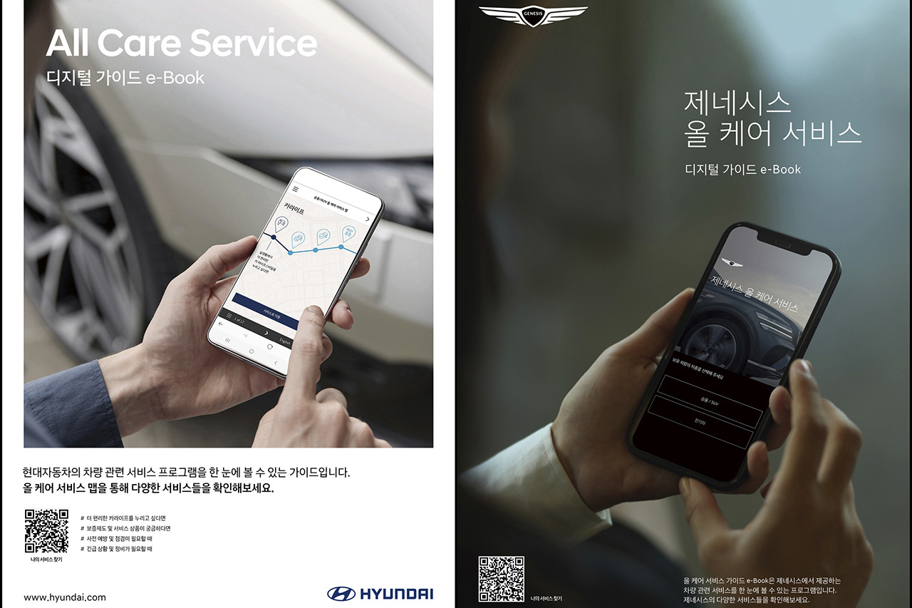 현대차는 이번 e-Book 출시를 통해 고객에게 높은 만족감을 선사하고, 향후 판매 활성화에도 기여할 수 있을 것으로 기대하고 있다. ‘올 케어 서비스 가이드 e-Book’은 오늘부터 현대차/제네시스 공식 홈페이지 및 차량 카탈로그에 삽입된 QR코드를 통해 누구나 열람할 수 있다. [현대차] [제네시스]
