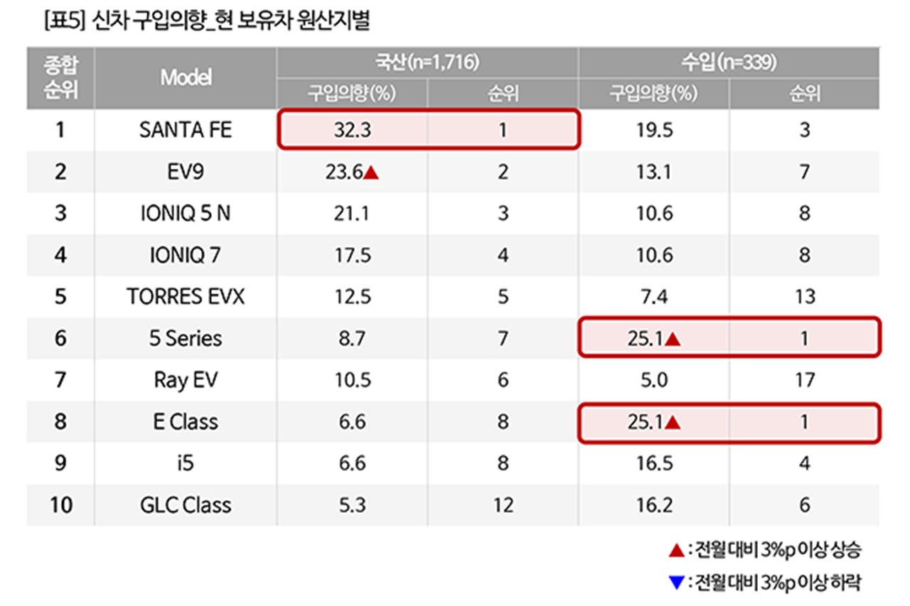 이번 구입 의향 조사 결과에서 눈에 띄는 부분은 BMW 5시리즈와 메르세데스-벤츠 E클래스간의 경쟁이다. 현재 수입차 보유 소비자를 대상으로 한 조사에서는 5시리즈와 E클래스 구입의향이 크게 상승해 공동 1위를 차지했다.