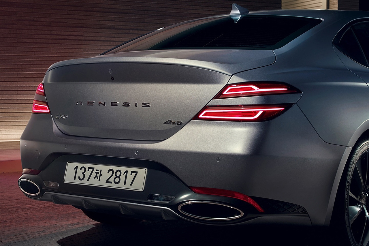 후면부는 쿼드램프로 제네시스의 정체성을 명확하게 표현했으며 듀얼 머플러와 차체와 동일한 색상의 디퓨저로 고성능 세단의 모습을 완성했다.