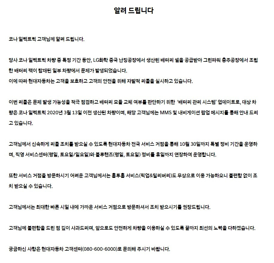 현대자동차가 지난해부터 발생한 화재로 이슈가 된 코나 일렉트릭의 화재 원인에 대한 공식입장과 리콜 계획은 밝혔다. 현대자동차에 따르면 LG화학 중국 난징공장에서 생산된 배터리 셀을 공급받아 충주 그린파워 공장에서 조립한 배터리 팩이 탑재된 일부 차량에서 문제가 발생했으며, 대상 차종은 2020년 3월 13일 이전 생산된 차량이다.