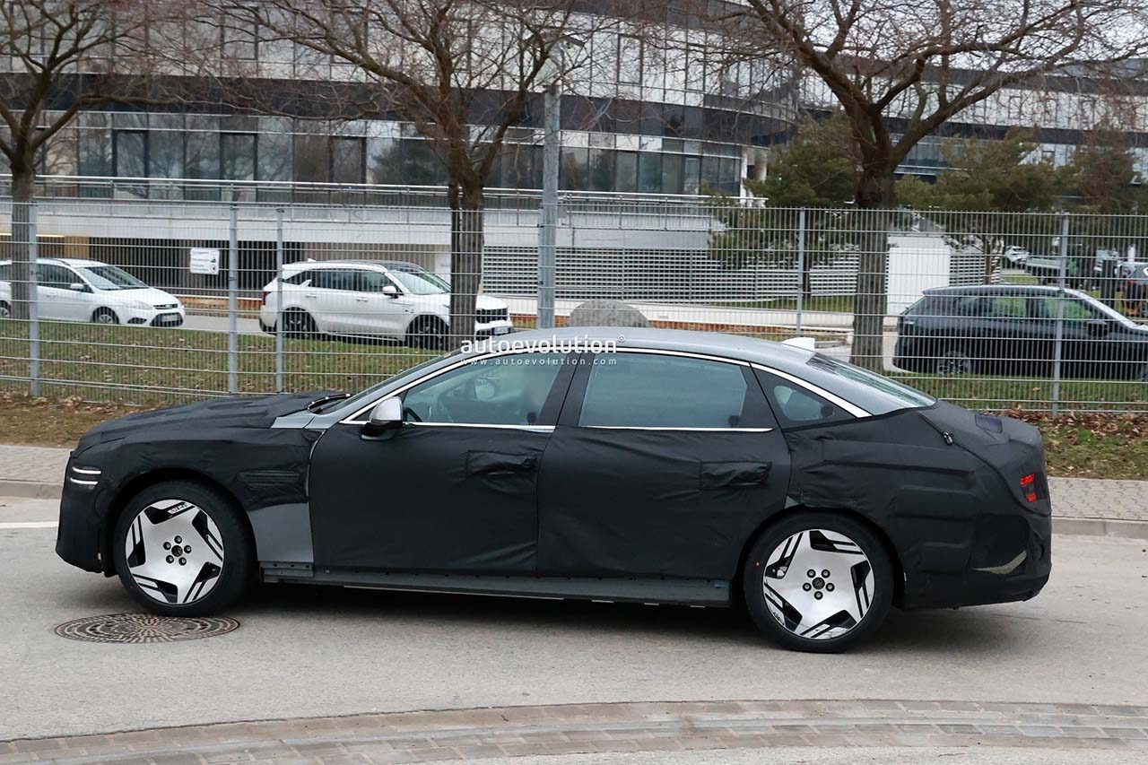 측면부는 G90 롱휠베이스 모델에 적용된 것과 유사한 20인치 휠이 눈에 띈다. 동일한 디자인으로 보일 수 있으나, 휠 안쪽 가니쉬가 G90은 6개, G80은 5개로 차이가 있다. 또한 2열 도어는 일반 G80 모델 대비 약 6cm 늘어난 것으로 알려졌다.