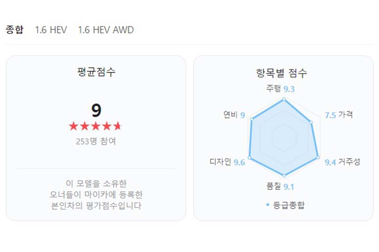 한편, 기아 쏘렌토 하이브리드 마이카 오너 평가는 실제 차주 253명의 평가 점수 평균으로 제작됐으며, 평가 차주가 늘어나면 평균 점수는 소폭 변경될 수 있다.