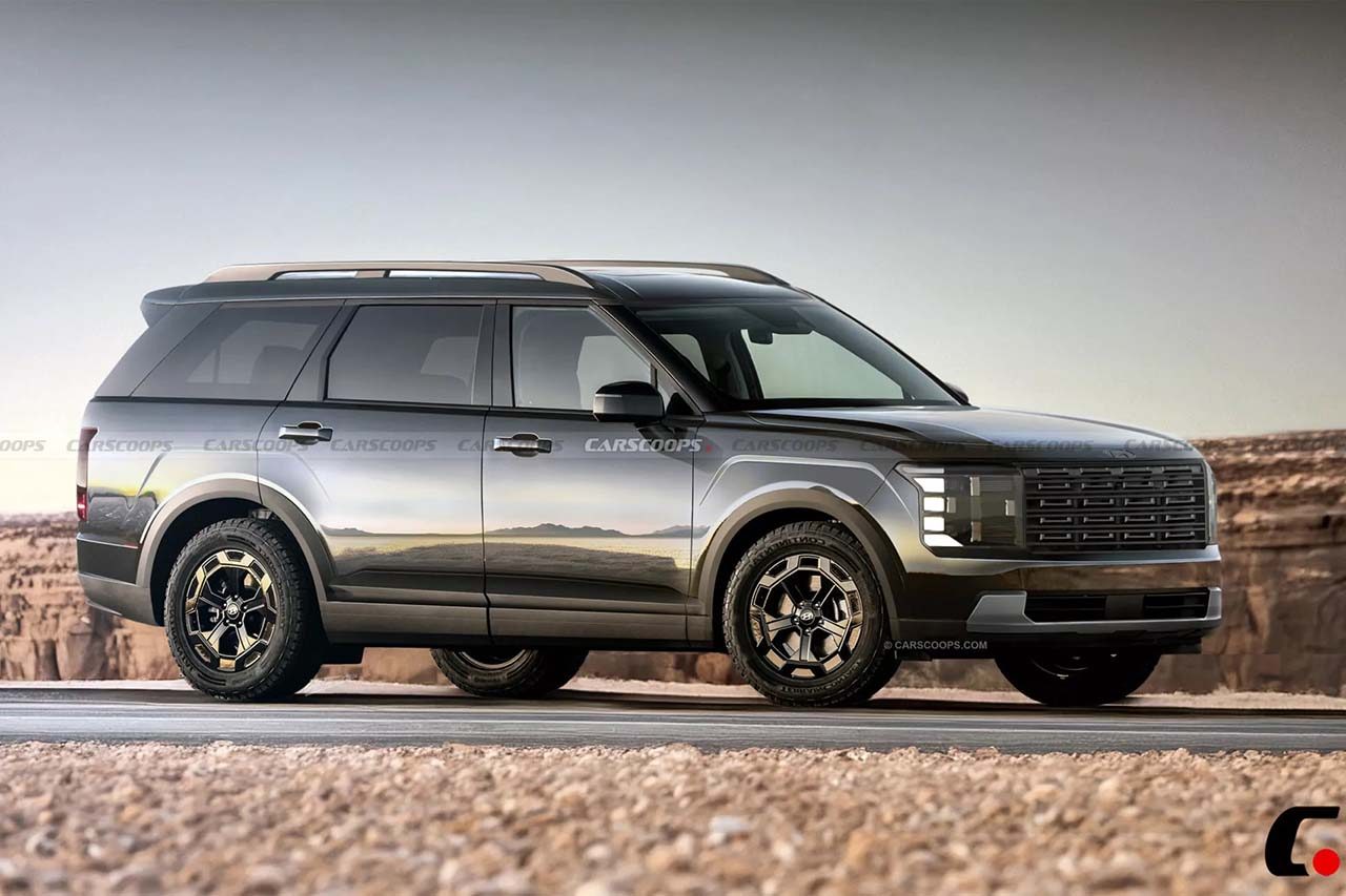 해외 자동차 전문 매체 카스쿱스(Carscoops)에서 공개한 신형 팰리세이드 예상도는 최신 테스트카 스파이샷을 기반으로 제작됐다. 전면부는 그릴과 하나로 연결된 헤드램프와 픽셀 패턴이 적용된 세로형 주간주행등이 특징이다.