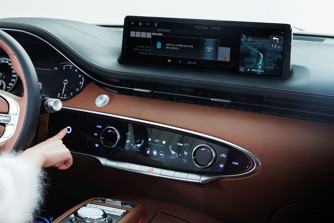GV70에는 차량 내 간편 결제 시스템 제네시스 카페이와 연동된 지문인증 기술이 적용됐다. 지문 인증으로 도어 개폐, 시동 및 주행 등이 가능한 기술은 이미 적용된 사례가 있지만 전자 결제 시 지문 인식만으로 기능을 실행할 수 있어 운전자의 편의성과 보안성을 향상시킨 이 기술은 자동차 업계 최초로 제네시스 GV70에 탑재됐다.