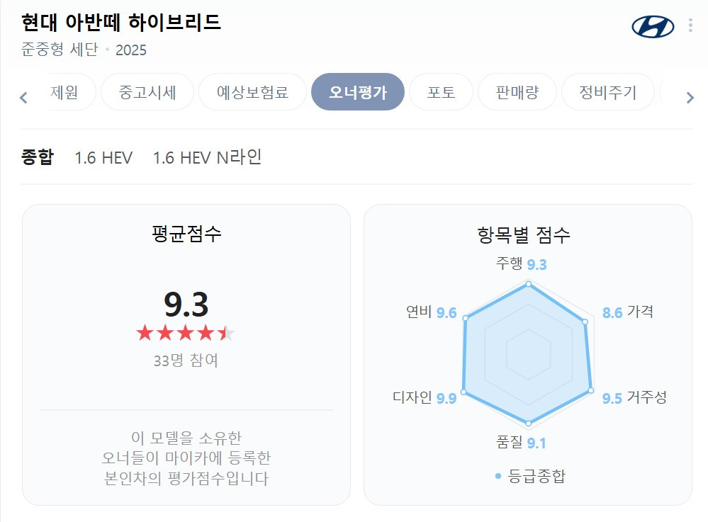 실제 차량 소유주들의 차량 평가 데이터를 취합한 네이버 마이카 오너 평가에 따르면 현대차 아반떼 하이브리드 차주들이 평가한 평균 점수는 9.3점의 높은 평가를 기록했다. 가격을 제외한 모든 항목이 9점대로 평가받았다.