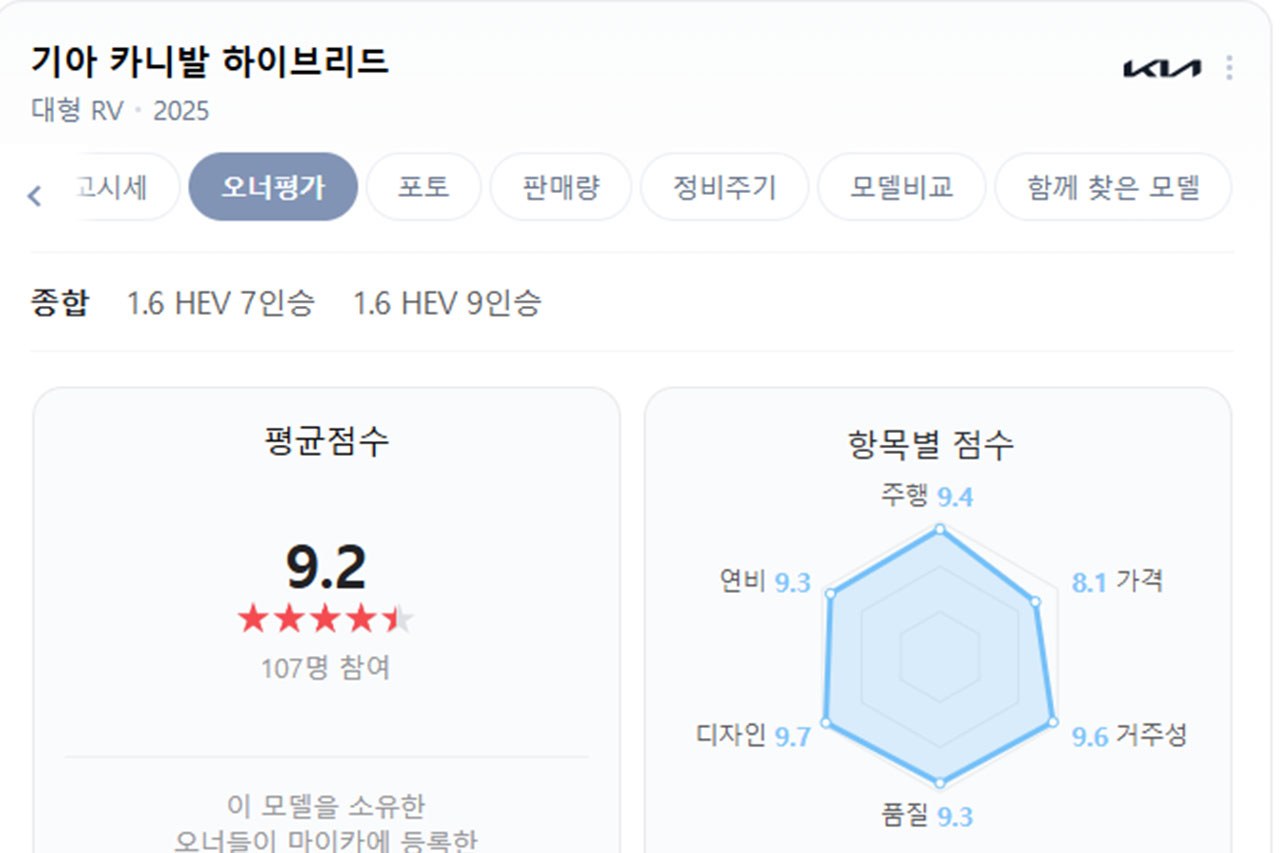 실제 차량 소유주들의 차량 평가 데이터를 취합한 네이버 마이카 오너 평가에 따르면 기아 카니발 하이브리드 차주들이 평가한 평균 점수는 9.2점의 높은 점수를 기록했다. 가격을 제외한 모든 항목이 9점 이상의 평가를 받았다.