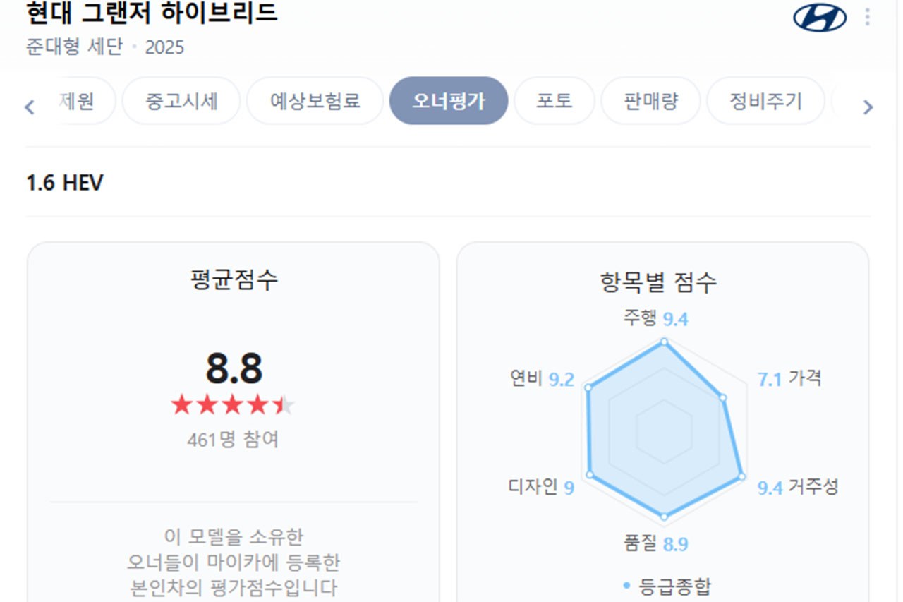 실제 차량 소유주들의 차량 평가 데이터를 취합한 네이버 마이카 오너평가에 따르면 현대차 그랜저 하이브리드 오너들의 평가한 평균 점수는 8.8점이다. 가격과 품질을 제외한 모든 항목이 9점 이상을 기록했다.