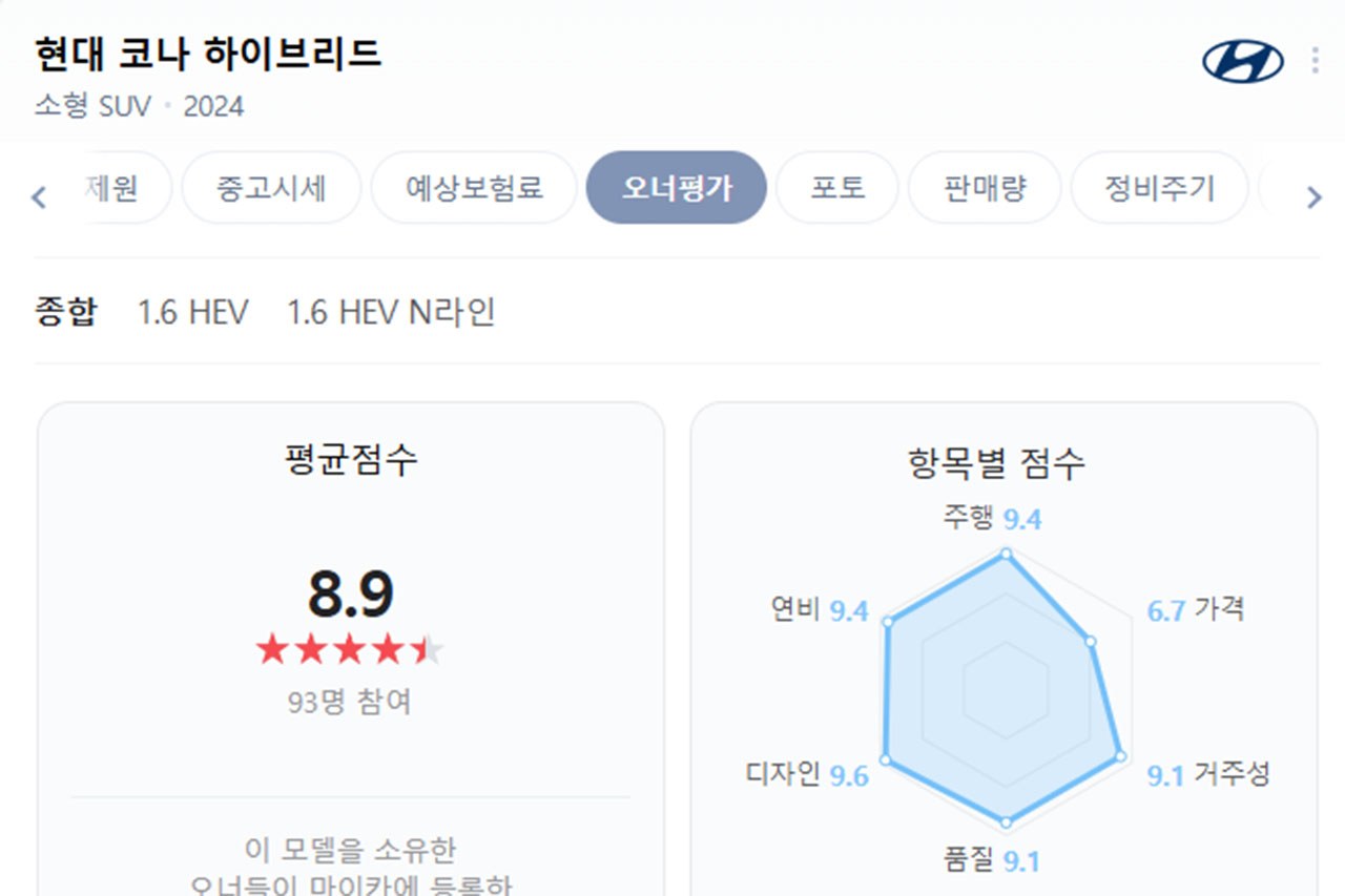 실제 차주들의 평가를 기반으로 차량 만족도 점수를 공개하는 ‘네이버 마이카 오너평가’에 따르면 현대차 코나의 오너평균 평균 점수는 8.9점이다.