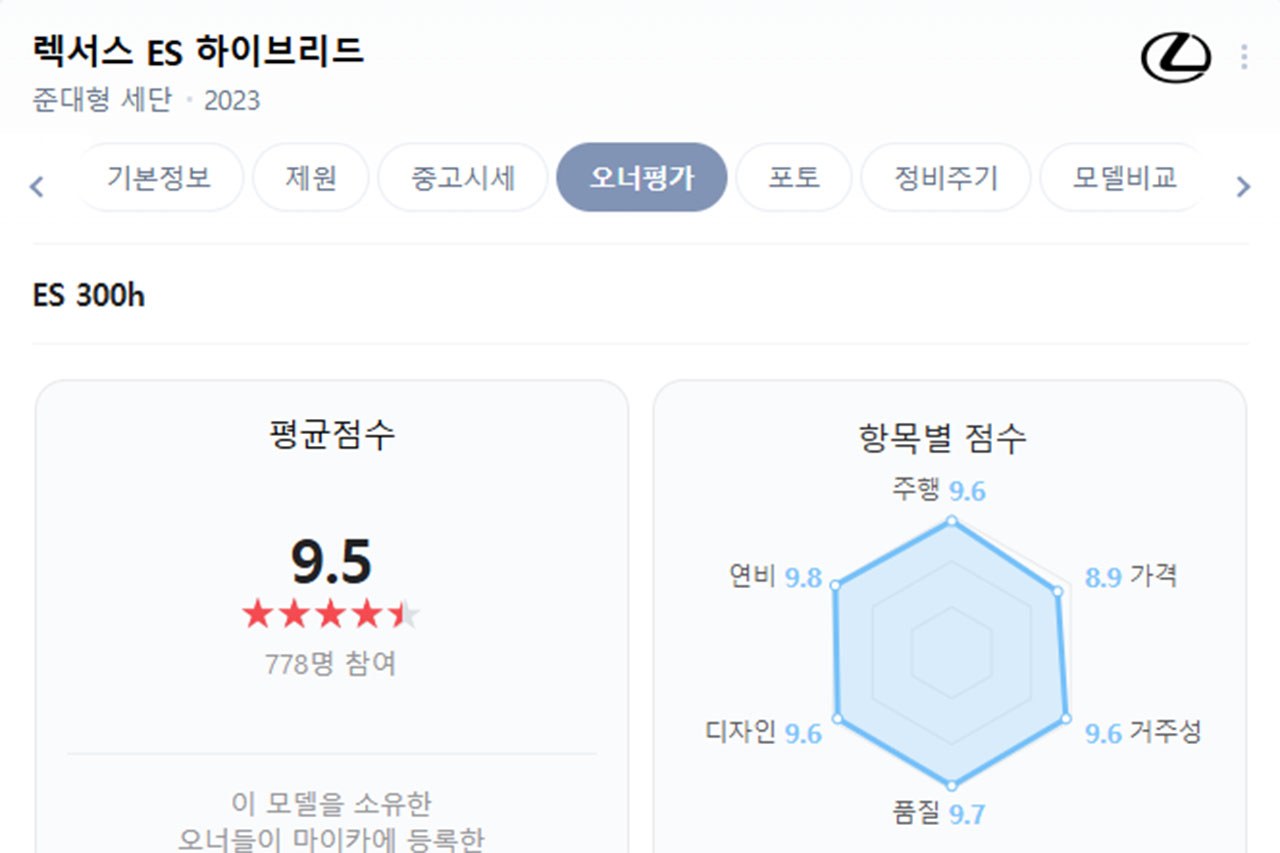 실제 차주들의 평가를 기반으로 차량 만족도 점수를 공개하는 ‘네이버 마이카 오너평가’에 따르면 렉서스 ES 하이브리드 300h의 오너평가 평균 점수는 9.5점으로 가격을 제외한 모든 항목이 9점 이상의 높은 점수를 기록했다.