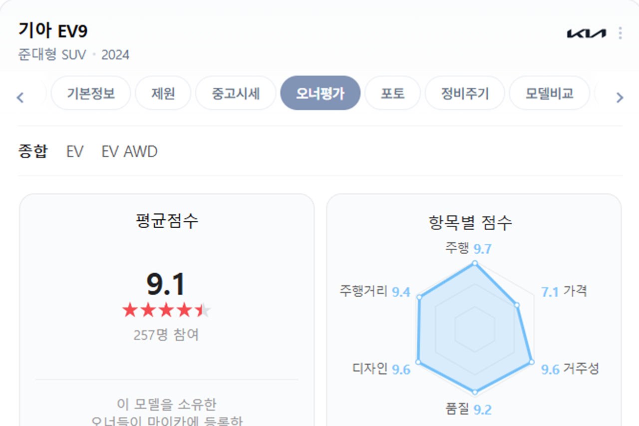 실제 차주들의 평가를 기반으로 차량 만족도 점수를 공개하는 ‘네이버 마이카 오너평가’에 따르면 기아 EV9의 평균 점수는 9.1점을 기록했다.